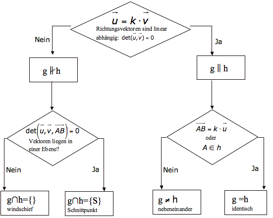 Die bislang dargestellten Grundaufgaben sind meistens nur Bestandteil dieser eigentlichen Hauptfrage. Wie die Lage von Geraden effizient bestimmt werden kann, zeigt folgender Entscheidungsbaum: